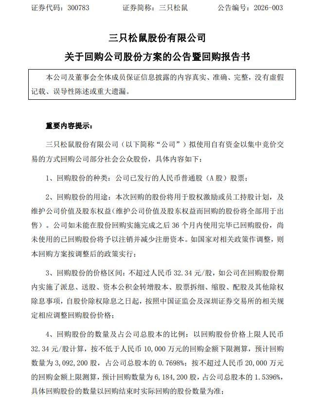 3月24日,三只松鼠(300783.SZ)公告称,公司拟使用自有资金以蚁合竞价样式回购股份,回购资金总和不低于1亿元、不跨越2亿元,回购价钱不跨越32.34元/股。按此测算,预测回购股份数目为309.22万股至618.42万股,占公司总股本的0.7698%至1.5396%。本次回购股份将用于股权激发或职工捏股计算,以及爱戴公司价值及推动权利(后者所回购股份将一齐用于出售)。若三年内未使用实现已回购股份,将赐与刊出并减少注册成本。