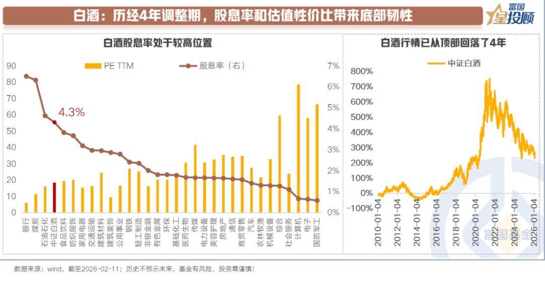 白酒已从顶部回落了4年。收尾2026年2月11日,指数估值回落至18倍,比近10年90%的时辰低廉。同期,股息率却高达4.3%。