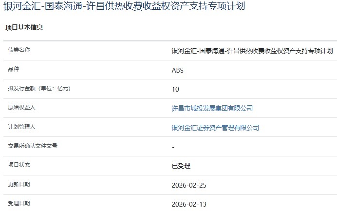 【大河财立方音问】2月25日,星河金汇-国泰海通-许昌供热收费收益权金钱维持专项计较获上交所受理。债券拟刊行金额10亿元,原始职权东谈主为许昌市城投发展集团有限公司,计较处理东谈主为星河金汇证券金钱处理有限公司。2025年7月23日,经联接资信玄虚评定,许昌市城投发展集团主体信用评级为AA+,瞻望褂讪。